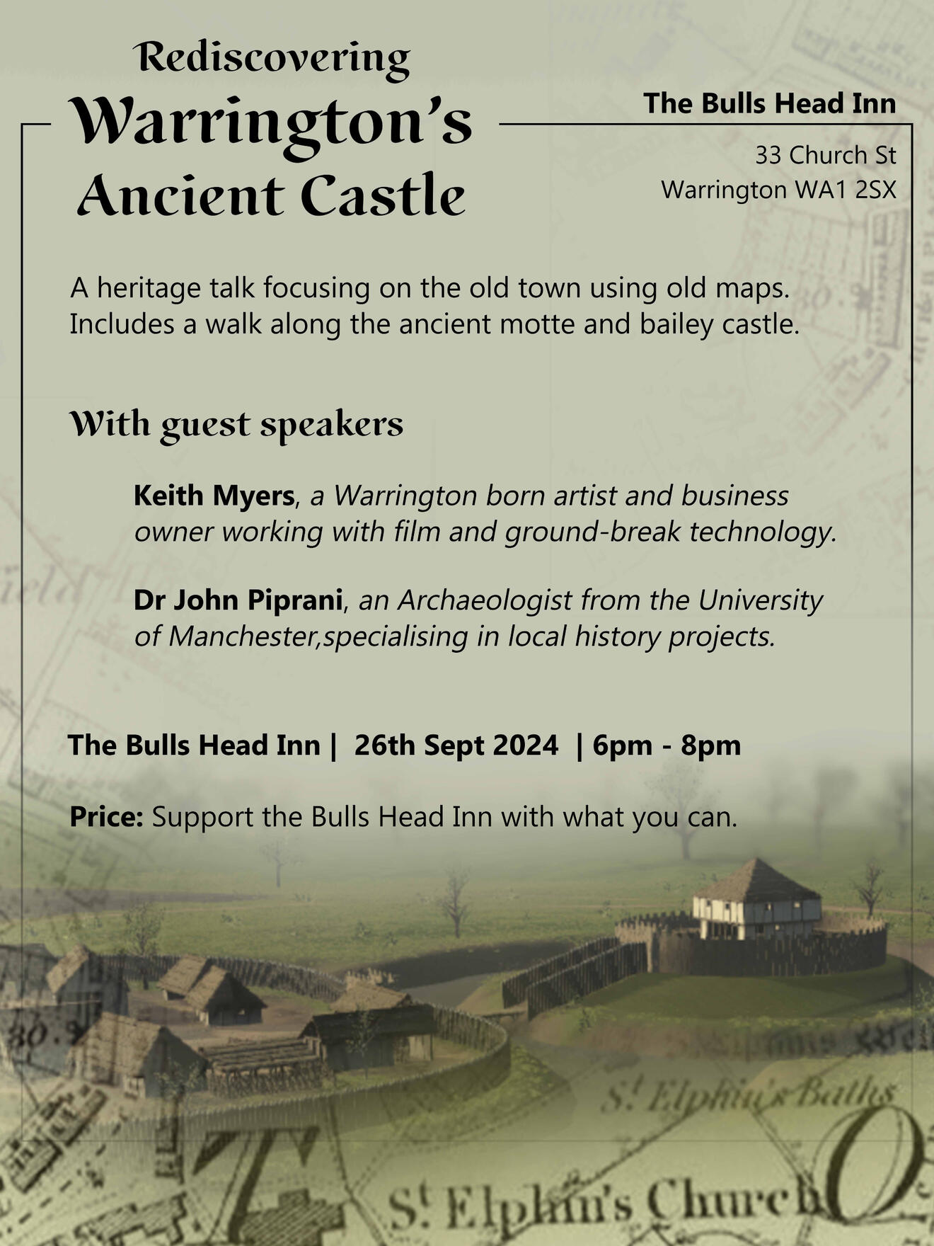 The Bulls Head Inn offered their space to use for showcasing our second public engagement event.We presented old maps of the area, followed by a short walk around the former motte and bailey site. The event was co-presented with Keith Myers, an artist from Warrington using cutting edge technology, and Dr John Piprani from The University of Manchester, who is not only an archaeologist, but an expert at creating community based heritage projects.You can continue to help and support local businesses by engaging in heritage. Make sure you come along to our next event.